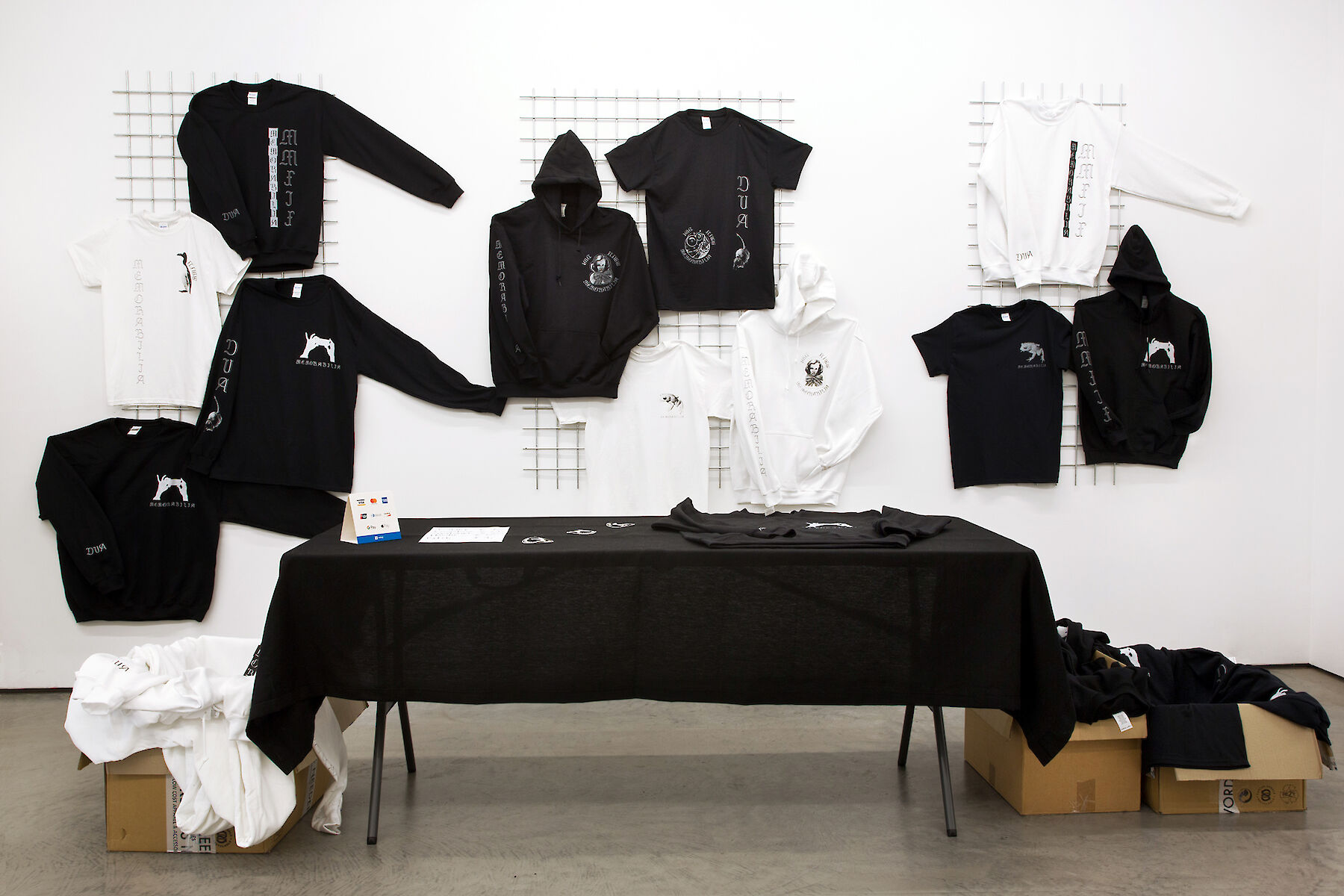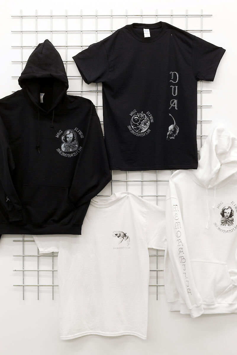 For my exhibition 'Memorabillia' at gallery tegenboschvanvreden in Amsterdam I've created a work called 'Merchtable'. The work is an autonomous work, but it was also possible to buy individual items from it. T-shirts, hoodies and patches. Inspired by touring bands who sell their merchandise for multiple reasons; to make money, to have a tangible memory of that concert and as a means of advertising your band, I've created this work with the same mindset. All the images on the merchandise were also to be found back in the exhibition, in this way my work became more accessible, there was something tangible left of the exhibition once it was over.