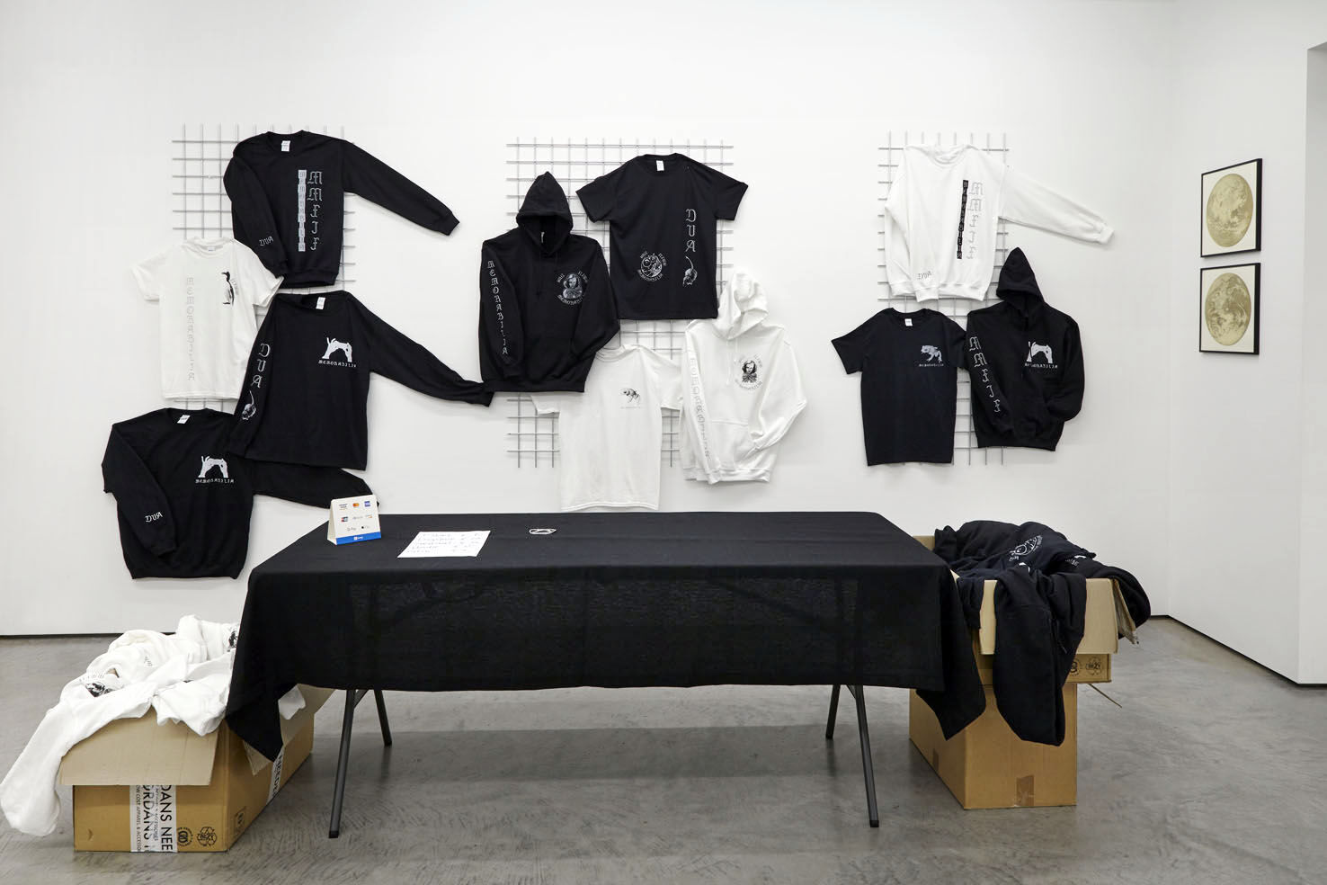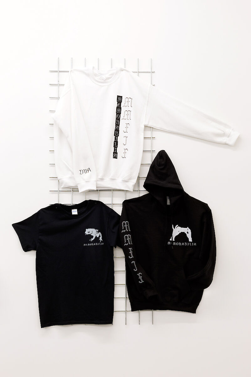 For my exhibition 'Memorabillia' at gallery tegenboschvanvreden in Amsterdam I've created a work called 'Merchtable'. The work is an autonomous work, but it was also possible to buy individual items from it. T-shirts, hoodies and patches. Inspired by touring bands who sell their merchandise for multiple reasons; to make money, to have a tangible memory of that concert and as a means of advertising your band, I've created this work with the same mindset. All the images on the merchandise were also to be found back in the exhibition, in this way my work became more accessible, there was something tangible left of the exhibition once it was over.